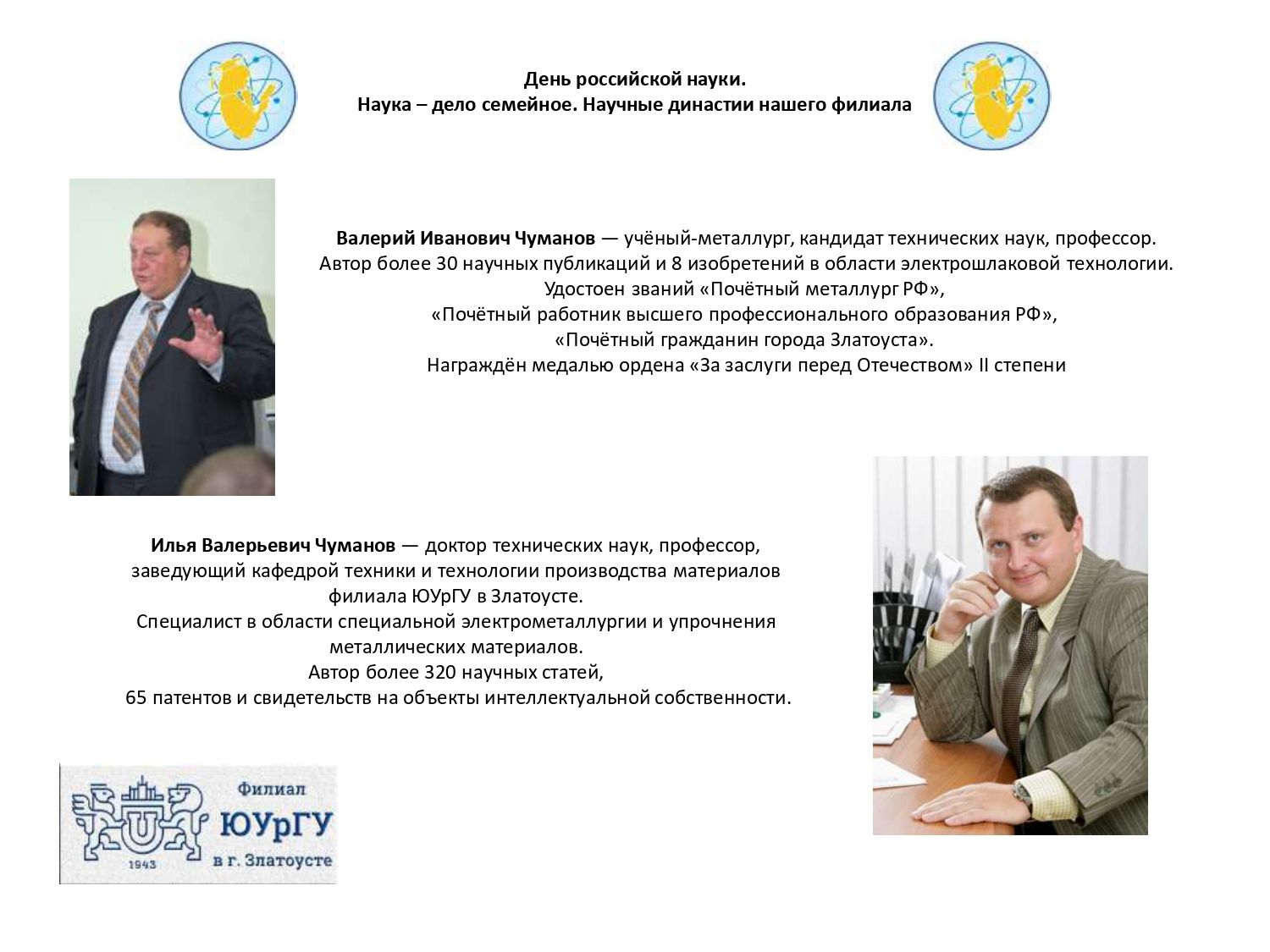 Точкой пересечения семейного и профессионального стал наш филиал для Валерия Ивановича Чуманова и Ильи Валерьевича Чуманова. Исследования в области специальной электрометаллургии и упрочнения металлических материалов закономерно привели талантливых и увлеченных исследователей к достойным результатам в преподавательской и научной работе.